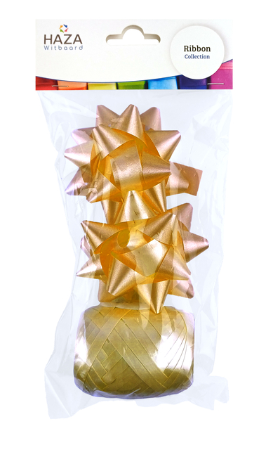 - Setje van één polyband eitje, en twee rozetten. Afmeting eitje: 5mmx20m. Afmeting rozetten: 15mm lint, Ø75mm. Kleur: goud.