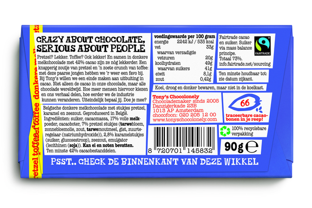 Pretzel? Lekker. Toffee? Ook lekker! En samen in donkere melkchocolade met 42% cacao zijn ze nòg lekkerder. Een knapperig zoutje van pretzel en ’n zoete crunch van toffee: met deze paarse jongen hebben we ‘r weer een favo bij. Nu in ’n kleiner reepje!Tony’s chocolonely – samen maken we een einde aan uitbuiting in cacao! Bij tony’s willen we een einde maken aan uitbuiting in cacao. Niet alleen de cacao in onze chocolade, maar alle chocolade wereldwijd. Hoe meer mensen hiervoor kiezen en ons verhaal delen, hoe eerder we de industrie kunnen veranderen. Uiteindelijk bepaal jij, doe je mee?