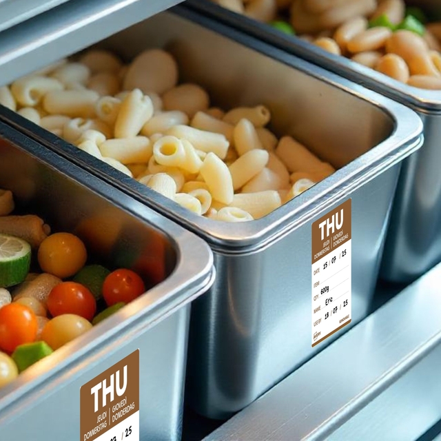 - Gekleurde voedsel-dagetiketten zijn essentieel voor efficiënt voorraadbeheer in de horeca. Ze maken het mogelijk om de bereidings- of openingsdatum van voedsel nauwkeurig te volgen. Dankzij een kleurcode per dag identificeert men in één oogopslag de producten die met voorrang gebruikt moeten worden. Dit helpt voedselverspilling te beperken en zorgt voor een optimaal voedselgebruik. Met deze labels voldoet men aan de HACCP-normen en vergemakkelijkt men de controle van de houdbaarheidsdatum. Dankzij de afneembare lijm zijn ze eenvoudig aan te brengen en te verwijderen. Ze kunnen worden gebruikt op alle soorten verpakkingen. In de keuken verbeteren ze de communicatie tussen teams door verwarring over de versheid van de producten te voorkomen. Het gebruik van daglabels betekent dagelijks tijd besparen en tegelijkertijd servicekwaliteit garanderen. Door te investeren in dit efficiënte etiketteringssysteem optimaliseren horeca-eigenaren zowel hun organisatie als hun winstgevendheid.