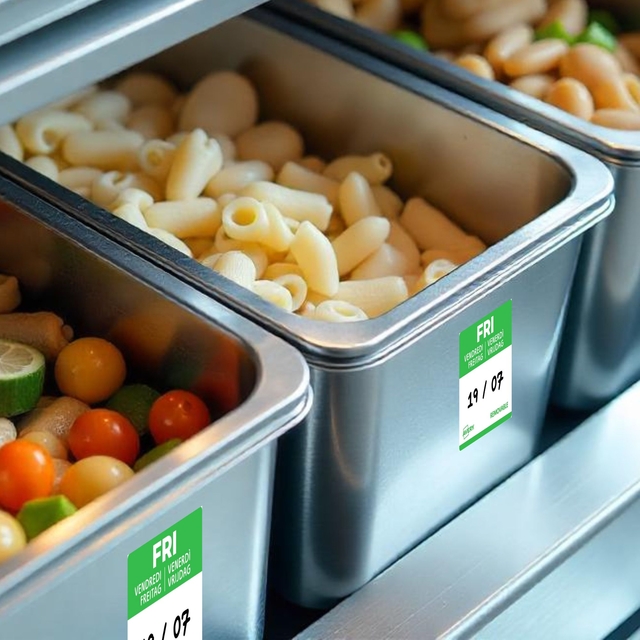 - Gekleurde voedsel-dagetiketten zijn essentieel voor efficiënt voorraadbeheer in de horeca. Ze maken het mogelijk om de bereidings- of openingsdatum van voedsel nauwkeurig te volgen. Dankzij een kleurcode per dag identificeert men in één oogopslag de producten die met voorrang gebruikt moeten worden. Dit helpt voedselverspilling te beperken en zorgt voor een optimaal voedselgebruik. Met deze labels voldoet men aan de HACCP-normen en vergemakkelijkt men de controle van de houdbaarheidsdatum. Dankzij de afneembare lijm zijn ze eenvoudig aan te brengen en te verwijderen. Ze kunnen worden gebruikt op alle soorten verpakkingen. In de keuken verbeteren ze de communicatie tussen teams door verwarring over de versheid van de producten te voorkomen. Het gebruik van daglabels betekent dagelijks tijd besparen en tegelijkertijd servicekwaliteit garanderen. Door te investeren in dit efficiënte etiketteringssysteem optimaliseren horeca-eigenaren zowel hun organisatie als hun winstgevendheid.