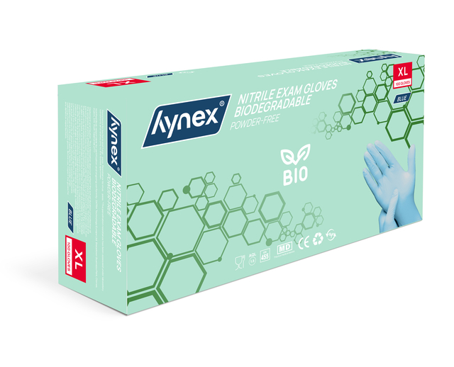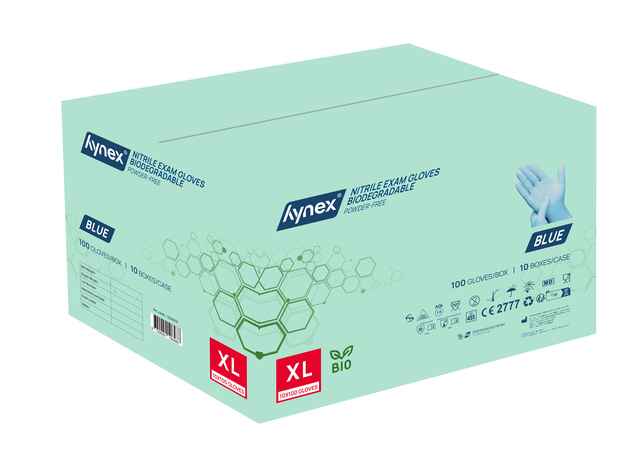 Duurzaam & comfortabel: biologisch afbreekbare nitril wegwerphandschoenen van Hynex Ontdek de nieuwste toevoeging aan het Hynex-assortiment: biologisch afbreekbare nitril wegwerphandschoenen. Met de introductie van deze biologisch afbreekbare handschoenen zetten we een logische stap in onze duurzame koers – zonder concessies te doen aan het ultieme draagcomfort en de optimale bescherming. En zoals je van Hynex gewend bent, geniet je nog steeds van de beste prijs-kwaliteitverhouding. Kies voor milieuvriendelijk gemak, zonder in te leveren op prestaties!Biologisch afbreekbare nitril wegwerphandschoenen De biologisch afbreekbare nitrilhandschoenen vormen een duurzaam alternatief. Dankzij de innovatieve toevoeging van bio-agentia in de formule behouden ze dezelfde betrouwbaarheid als gewone nitril wegwerphandschoenen. Dit betekent dat ze, zodra ze in contact komen met specifieke micro-organismen in de bodem, op natuurlijke wijze worden afgebroken zonder schadelijke resten achter te laten.Voor jouw gebruiksgemak Gemaakt van 100% biologisch afbreekbaar nitril, zijn deze handschoenen poedervrij en oppervlakte-gechloreerd voor extra comfort. Ze bieden een superieure sterkte, verbeterde lekbestendigheid en uitstekende chemische spatbescherming. Nitril heeft als eigenschap dat dit goed vormt naar de hand tijdens gebruik. Hierdoor heb je een goede grip, ook bij het werken in of met natte of geoliede producten of omgevingen. De getextureerde vingertoppen zorgen voor een betere grip bij zowel natte als droge omstandigheden, terwijl ze ook zorgen voor een optimale tastgevoeligheid waardoor ze een precieze aanraking mogelijk maken. Bovendien bieden deze handschoenen betrouwbare bescherming tegen bacteriën en schimmels. De gekrulde rand extra biedt extra gemak bij het aan- en uittrekken, zorgt ervoor dat vloeistoffen niet langs de arm lopen en voorkomt het terugdraaien van de handschoenen. Bovendien zijn ze zowel links als rechts te dragenSterk en betrouwbaar Nitril wegwerphandschoenen zijn sterker dan latex, rubber of vinyl handschoenen. Ze voorkomen besmettingsgevaar tijdens werkzaamheden waar hygiëne voorschriften belangrijk zijn. Werk je in de voedingsmiddelenindustrie, laboratoria, horeca of zorgsector? Dan zijn deze handschoenen de beste keuze! Nitril voor iedereen Verminder de kans op een latex allergie door puur en alleen nitril handschoenen te gebruiken. Tijdens het gebruik wordt huidirritatie voorkomen doordat de nitril handschoenen latex- en poedervrij zijn. Let op: niet steriel en geschikt voor eenmalig gebruik. Draag wegwerphandschoenen niet te lang, probeer ze elk 2 uur te vervangen voor een nieuw paar. Specificaties: