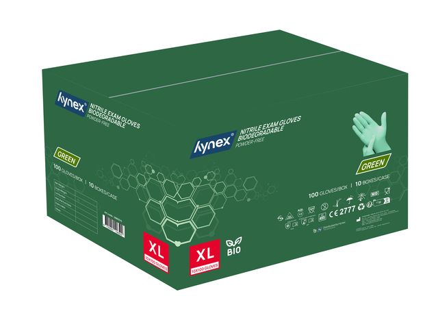 Duurzaam & comfortabel: biologisch afbreekbare nitril wegwerphandschoenen van Hynex Ontdek de nieuwste toevoeging aan het Hynex-assortiment: biologisch afbreekbare nitril wegwerphandschoenen. Met de introductie van deze biologisch afbreekbare handschoenen zetten we een logische stap in onze duurzame koers – zonder concessies te doen aan het ultieme draagcomfort en de optimale bescherming. En zoals je van Hynex gewend bent, geniet je nog steeds van de beste prijs-kwaliteitverhouding. Kies voor milieuvriendelijk gemak, zonder in te leveren op prestaties!Biologisch afbreekbare nitril wegwerphandschoenen De biologisch afbreekbare nitrilhandschoenen vormen een duurzaam alternatief. Dankzij de innovatieve toevoeging van bio-agentia in de formule behouden ze dezelfde betrouwbaarheid als gewone nitril wegwerphandschoenen. Dit betekent dat ze, zodra ze in contact komen met specifieke micro-organismen in de bodem, op natuurlijke wijze worden afgebroken zonder schadelijke resten achter te laten.Voor jouw gebruiksgemak Gemaakt van 100% biologisch afbreekbaar nitril, zijn deze handschoenen poedervrij en oppervlakte-gechloreerd voor extra comfort. Ze bieden een superieure sterkte, verbeterde lekbestendigheid en uitstekende chemische spatbescherming. Nitril heeft als eigenschap dat dit goed vormt naar de hand tijdens gebruik. Hierdoor heb je een goede grip, ook bij het werken in of met natte of geoliede producten of omgevingen. De getextureerde vingertoppen zorgen voor een betere grip bij zowel natte als droge omstandigheden, terwijl ze ook zorgen voor een optimale tastgevoeligheid waardoor ze een precieze aanraking mogelijk maken. Bovendien bieden deze handschoenen betrouwbare bescherming tegen bacteriën en schimmels. De gekrulde rand extra biedt extra gemak bij het aan- en uittrekken, zorgt ervoor dat vloeistoffen niet langs de arm lopen en voorkomt het terugdraaien van de handschoenen. Bovendien zijn ze zowel links als rechts te dragenSterk en betrouwbaar Nitril wegwerphandschoenen zijn sterker dan latex, rubber of vinyl handschoenen. Ze voorkomen besmettingsgevaar tijdens werkzaamheden waar hygiëne voorschriften belangrijk zijn. Werk je in de voedingsmiddelenindustrie, laboratoria, horeca of zorgsector? Dan zijn deze handschoenen de beste keuze! Nitril voor iedereen Verminder de kans op een latex allergie door puur en alleen nitril handschoenen te gebruiken. Tijdens het gebruik wordt huidirritatie voorkomen doordat de nitril handschoenen latex- en poedervrij zijn. Let op: niet steriel en geschikt voor eenmalig gebruik. Draag wegwerphandschoenen niet te lang, probeer ze elk 2 uur te vervangen voor een nieuw paar. Specificaties: