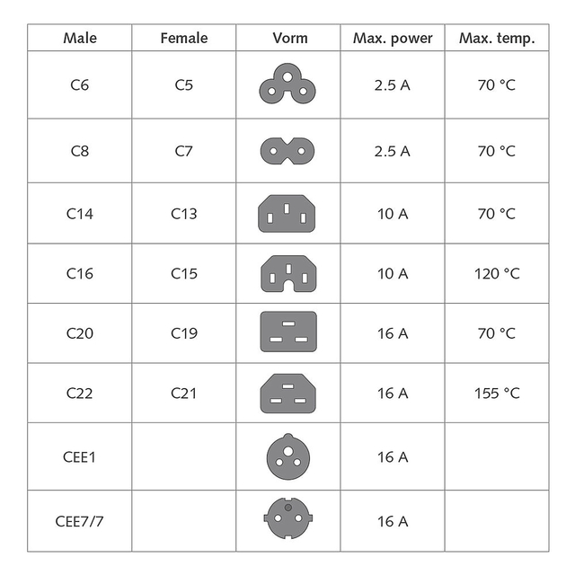 - Connectoren: Schuko CEE 7/7 male (haaks) – C13 IEC 60320.