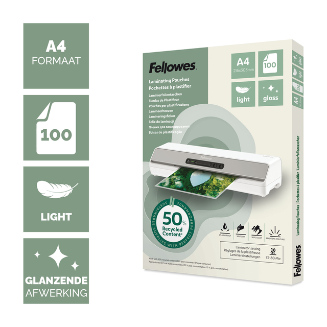 - Geef je documenten een nette, professionele uitstraling met deze A4 lamineerhoezen, ontworpen voor dagelijks gebruik en duurzame prestaties. Gemaakt van 50% gerecycled materiaal (minimaal 35% post-consumer, 15% pre-consumer) bieden ze betrouwbare bescherming en ondersteunen ze milieubewuste keuzes. De hoogwaardige glansafwerking zorgt voor veelzijdigheid en visuele aantrekkingskracht, ideaal voor een breed scala aan lamineertaken. Ontworpen voor gebruik op een instelling van 70/80 micron bevat elke hoes een antistatische toevoeging voor soepel en probleemloos gebruik. Verpakt in papiergebaseerde materialen uit duurzame bronnen, inclusief de hoesdrager, tape en buitenverpakking, is deze set van 100 hoezen een slimme keuze voor zowel thuis als op kantoor.