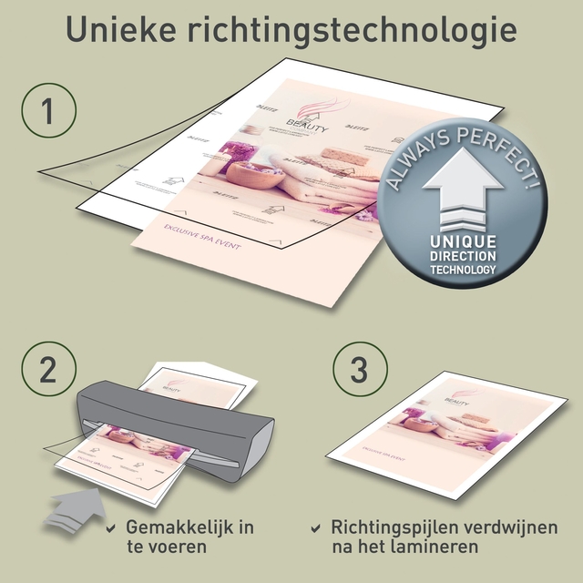 - Dankzij het ontwerp met UDT (Unique Direction Technology) zorgen pijlen op elke hoes ervoor dat ze correct worden ingevoerd voor een soepele, storingsvrije lamineerervaring.