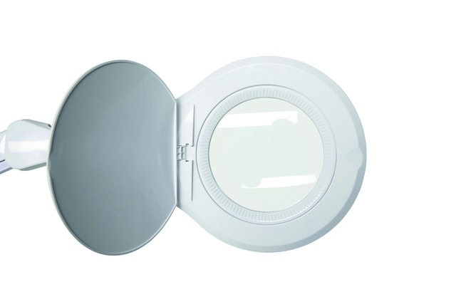 - Dubbele functie: loep en doelmatige werkplekverlichting. Inclusief lens beschermdeksel, waardoor stof en direct zonlicht wordt vermeden. 3 Dioptrie lens (1,75-voudige vergroting), Ø 5″ (12,7 cm), lensoppervlakte 126 cm². Diffusor zorgt voor minder schaduwwerking. Robuuste metalen arm. Driedimensioneel verstelbare lampenkap. Vervanging van lichtbron en voorschakelapparatuur mogelijk.