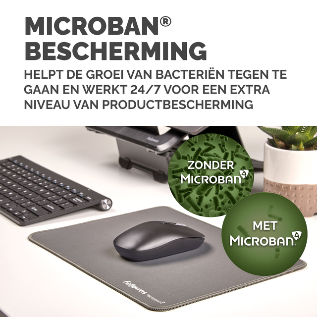 Meer dan 25% groter dan onze standaard muismatten voor meer bewegingsvrijheid, waardoor kleine herhaalde bewegingen die pijn in de pols kunnen veroorzaken, worden verminderd. Bescherm uw bureaublad en verbeter de prestaties van uw muis met deze muismatten die geschikt zijn voor optische en lasermuizen. De ingebouwde Microban®-bescherming helpt de groei van bacteriën te voorkomen en werkt 24/7 voor een extra bescherming van het product. Gemaakt van 83% gerecycled materiaal.