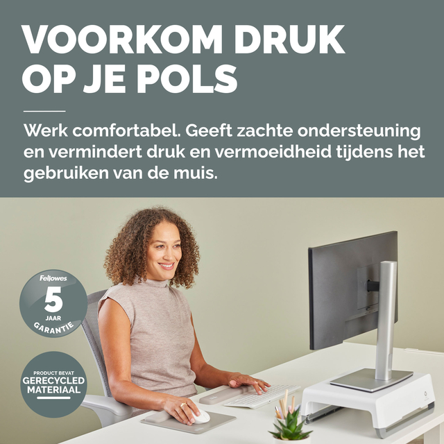 De HEX Cushion Technology™, waarvoor patent is aangevraagd, zorgt voor een gelijkmatige ondersteuning en supercomfort tijdens het muisgebruik. De zachte, stofwerende polssteun heeft een mooie afwerking en zorgt voor een soepele muiservaring. De ingebouwde Microban®-bescherming helpt de groei van bacteriën tegen te gaan en werkt 24/7 voor extra bescherming van het product. Bescherm je bureau en verbeter de prestaties van je muis met deze muismat die geschikt is voor optische en lasermuizen. Gemaakt van 69% gerecycled materiaal en 100% recyclebaar met het terugnameprogramma van Fellowes. Gemaakt om lang mee te gaan met 5 jaar beperkte garantie. Getest door FIRA International Ltd om te voldoen aan de ergonomische eisen van de Europese gezondheids- en veiligheidswetgeving: EN ISO 9241-5.