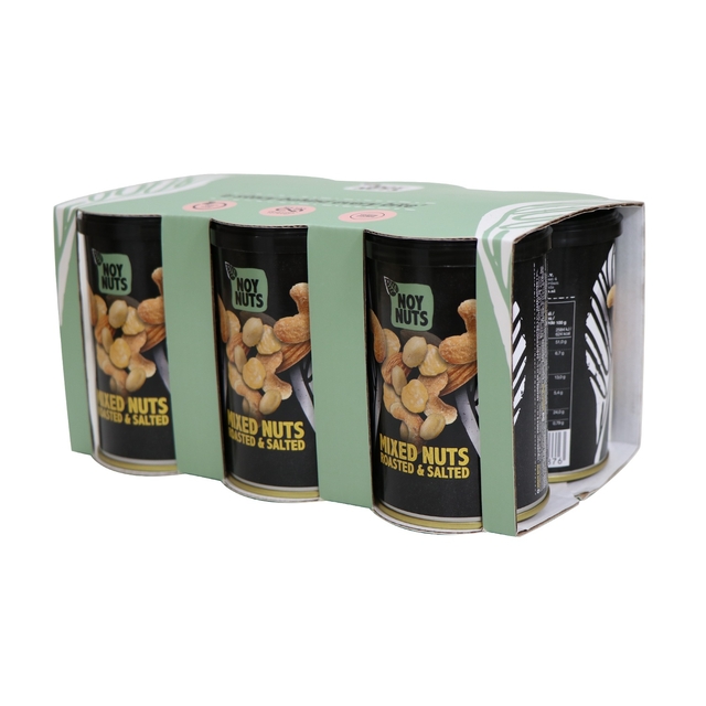 - NoyNuts Mix Nuts bestaat uit een heerlijke mix van geroosterde en gezouten pinda’s, hazelnoten, amandelen en cashewnoten. Een blikje bevat 150 gram. Een gezonder alternatief voor snacks. Lekker voor tussendoor. Hygiënisch per stuk verpakt. Probeer ook de andere producten uit het assortiment.