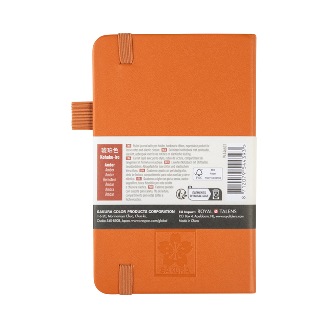 - Het Sakura harde kaft notitieboek is een journal van hoge kwaliteit. Het notitieboek heeft 80 vellen FSC-gecertificeerd papier, licht crèmewit van kleur voor optimale leesbaarheid. De klassieke regelafstand (7 mm) zorgt voor comfortabel schrijven met voldoende ruimte om je handschrift gemakkelijk opnieuw te lezen. Het stevige 140 g/m² zuurvrije papier voor het maken van aantekeningen en het bijhouden van gegevens is vrijwel geschikt voor elk type peninkt, waardoor je schrijfwerk niet doordrukt. Het Sakura notitieboek heeft een amberkleurige harde kaft met afgeronde hoeken, een elastische sluitband, een leeslint en een uitbreidbare pocket aan de achterkant voor het verzamelen van losse aantekeningen. Afmeting: Pocket – 14 x 9 cm