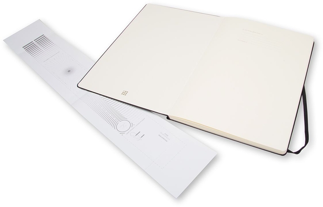 - Ieder Moleskine boek is genaaid gebrocheerd, heeft afgeronde hoeken, zuurvrij papier, een bladwijzer (lintje), een elastieken sluiting en een flexibel binnencompartiment waarin de geschiedenis van Moleskine zit opgeborgen.