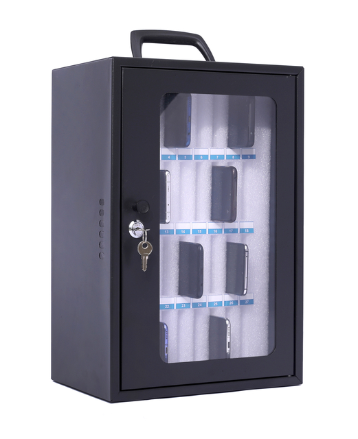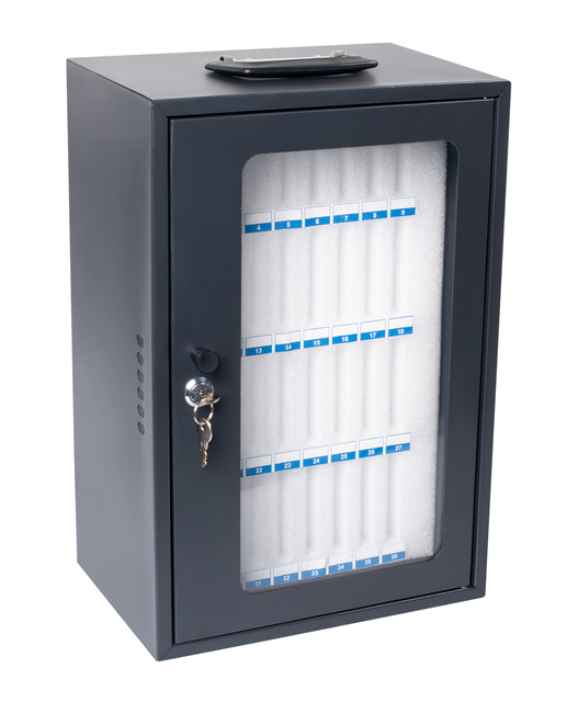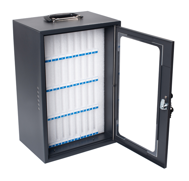 De Pavo-smartphonekluis is een efficiënte en veilige opslagoplossing die perfect is voor het opbergen van mobiele telefoons in onderwijsinstellingen, sportclubs en andere organisaties. Deze opbergkast van staal met een acryldeur is ontworpen om tot 36 smartphones op een georganiseerde en krasvrije manier op te bergen. Elk apparaat krijgt zijn eigen plek in zachte schuimcompartimenten die optimale bescherming bieden en individueel genummerd zijn, zodat gebruikers hun telefoons snel en gemakkelijk kunnen terugvinden. De kluis is beveiligd met een sleutelslot, waardoor een veilige opslag tijdens lessen of trainingen wordt gegarandeerd. Hij kan worden gebruikt als draagbare optie, omdat hij is uitgerust met een handvat, of aan de muur worden bevestigd voor extra veiligheid en ruimtebesparing.De kluis is zeer geschikt voor het tijdelijk opbergen van smartphones op scholen, (sport)clubs, klinieken en andere plaatsen waar telefoons niet zijn toegestaan.