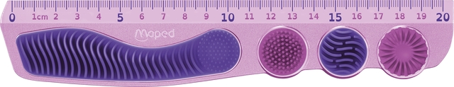Een Kidy Learn Concentration set bestaande uit een slijper met rotatieve elementen en soft touch texturen met een handig reservoir en een gat dat afgesloten kan worden, een liniaal met sensoriële elementen, een gum met structuur en een potlood met een kauwtopper. Aanbevolen door leerkrachten omwille van het stress-reducerend effect en het verhogen van de concentratie. Kleur: paars.
