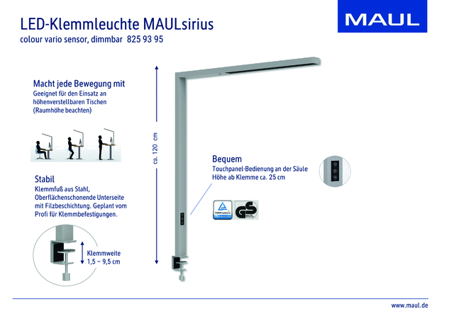 - Hoogwaardige aluminium designlamp met makkelijke en moderne lichtbediening. Constante lichtregeling door bewegings- en daglichtsensor. Kleurtemperatuur en lichtsterkte traploos instelbaar afhankelijk van het tijdstip en de toepassing. Dimmer is traploos instelbaar naar persoonlijke behoefte. Licht is minder belastend voor de ogen door de gereduceerde schittering naar UGR <6. Gescheiden bediening: direct licht op de werkplek, naar beneden 30%, en indirect licht als ruimte-verlichting, naar boven 70%. TUV-GS certificaat (geprüfte Sicherheit), Technisch veiligheidsconcept Made by MAUL.