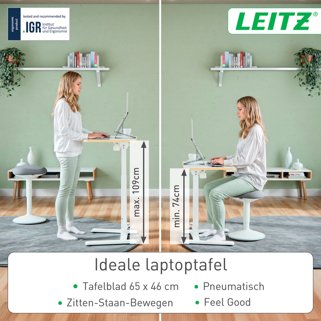 - Schakel moeiteloos tussen zitten en staan met de pneumatische hoogteverstelling (74-109cm) om pijn te voorkomen en spierbeweging te stimuleren voor een beter welzijn.
